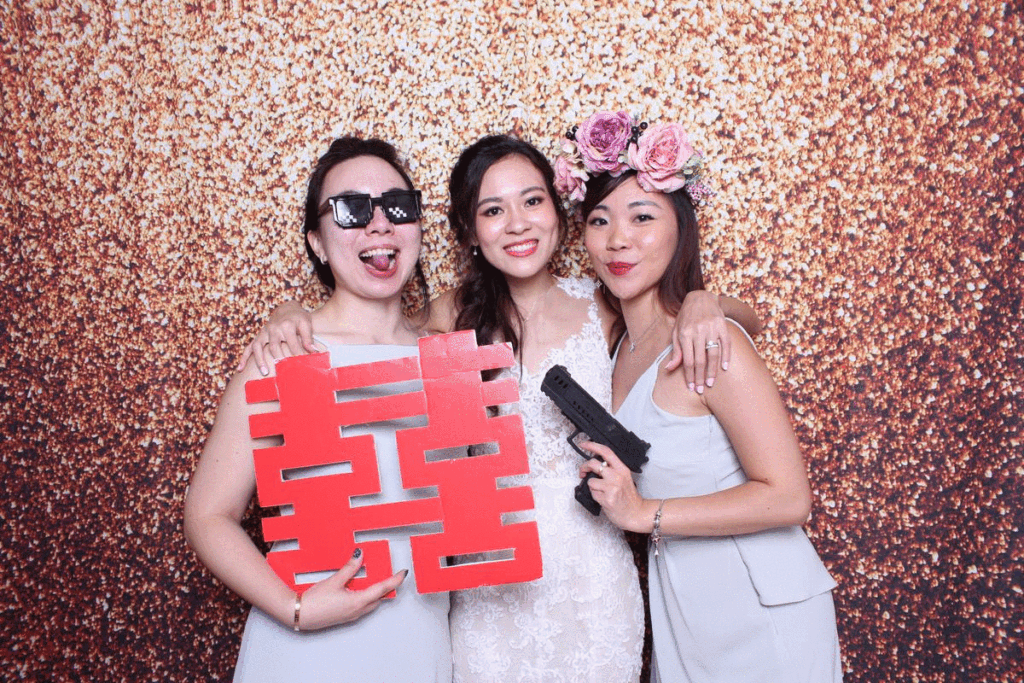 Our wedding GIF photo booth rental has become a staple at church weddings, solemnization ceremonies and wedding banquets. The wedding couple can look forward to personalising their GIF photo booth prints with a photograph from their pre-wed photo shoot. Our in-house graphic designer will put together your chosen photo in a stylish watercolor floral artwork to suit your wedding color theme. And there’s more to love! Our wedding GIF photo booth packages also come with hilarious props with apt quotes for the bride, groom & wedding entourage to tease, play and share a good natured joke together on your big day!
