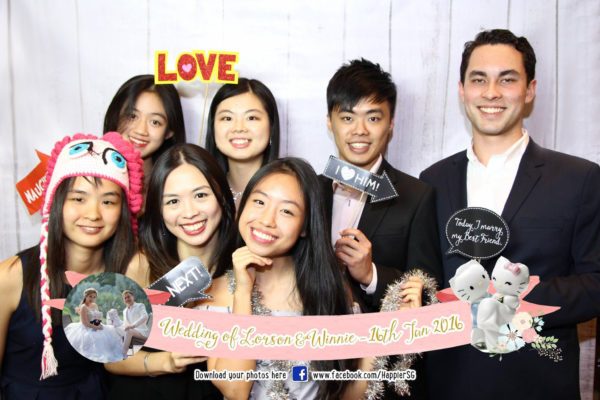 Our wedding photo booth rental has become a staple at church weddings, solemnization ceremonies and wedding banquets. The wedding couple can look forward to personalising their instant photo booth prints with a photograph from their pre-wed photo shoot. Our in-house graphic designer will put together your chosen photo in a stylish watercolor floral artwork to suit your wedding color theme. And there’s more to love! Our wedding photo booth packages also come with hilarious props with apt quotes for the bride, groom & wedding entourage to tease, play and share a good natured joke together on your big day!