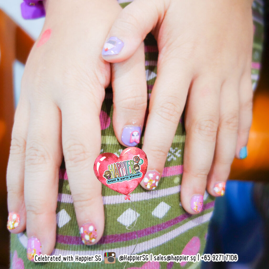 A professionally done nail art plus manicure at a saloon typically takes 1 hour per pax so you must be wondering how are we going to paint all the kids at your party. Well, that’s because we adapt the methods and type of nail art specially to cater for children birthday parties.
